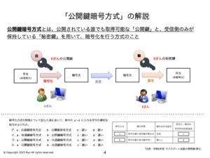 - 代表的なアルゴリズム: RSA、ElGamal、楕円曲線暗号など。特にRSAは、現在最も広く使われている公開鍵暗号方式です。