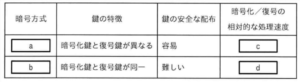 暗号化方式の特徴について記した表において、表中の a~d に入れる字句の適切な組合せはどれか。