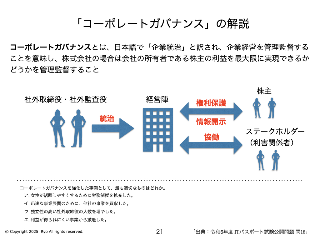 「コーポレートガバナンス」の解説 〜 ITパスポート R6年 問18 〜