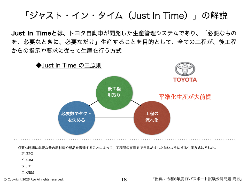 「ジャスト・イン・タイム(Just In Time)」の解説 〜 ITパスポート R6年 問15 〜
