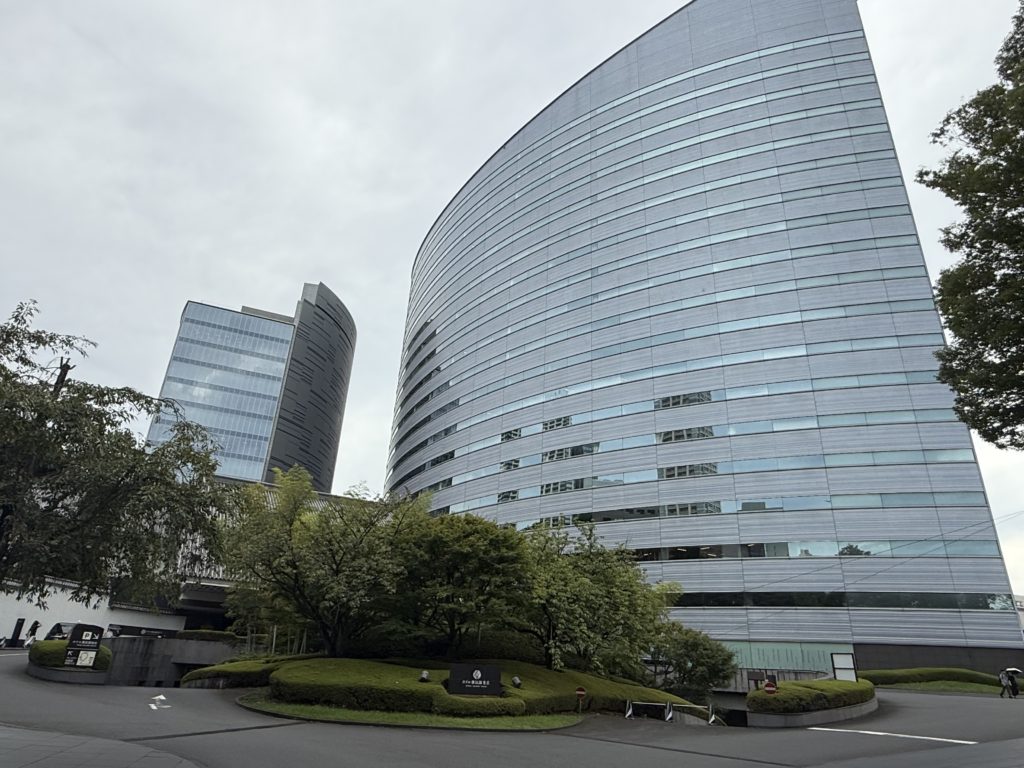 目黒駅東口を出て、目黒通りを下っていくと、すぐにホテルの案内が見えてきます。大きなホテルですが、その外観は、周囲の緑や渓流と調和しており、どこか落ち着いた雰囲気を醸し出しています。ホテル全体が、都会の喧騒から少し離れた、静かな高台に位置しているのが特徴です。