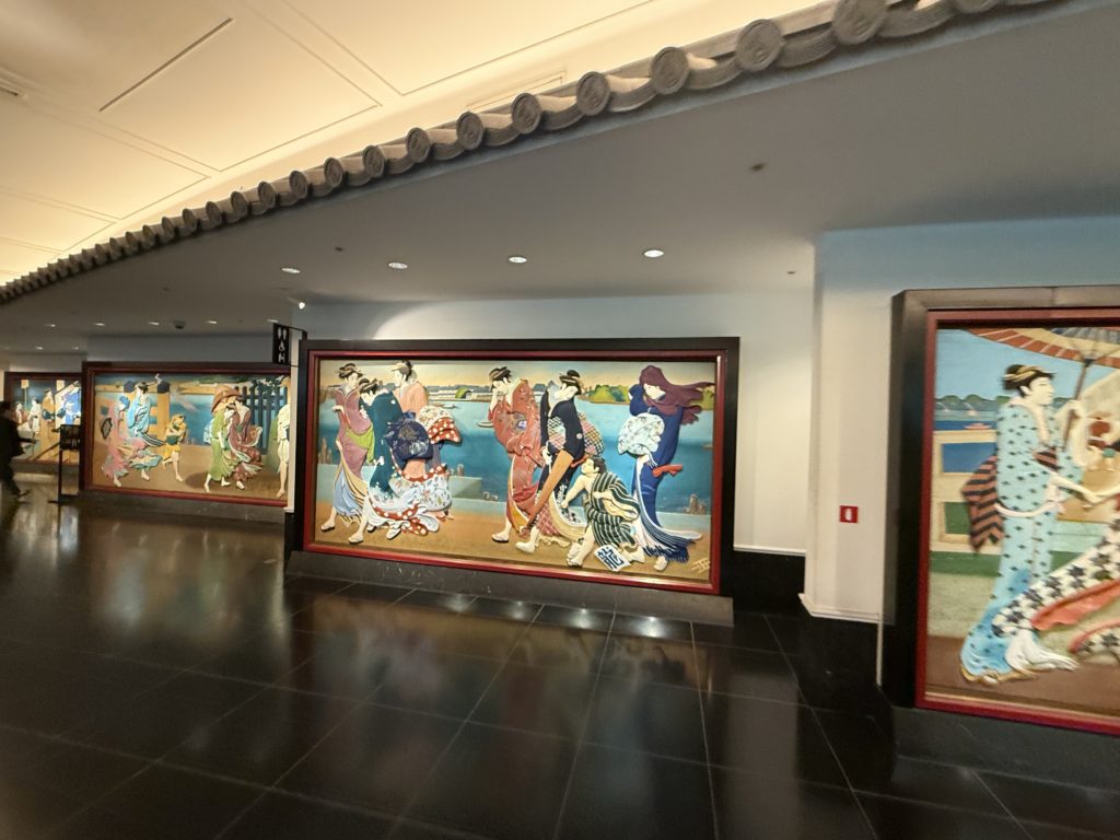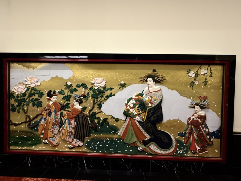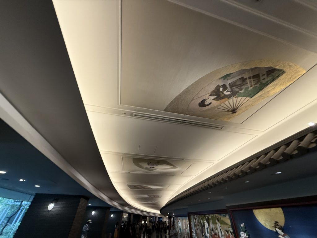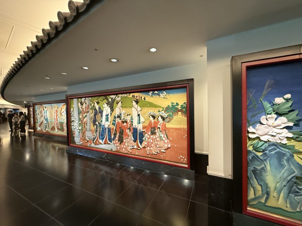 ロビーに入った瞬間、まず目に飛び込んできたのは、至る所に飾られた美しい日本画や美術工芸品です。壁や天井、柱の装飾に至るまで、細部にわたって日本の伝統美が息づいています。まさに、「美術館の中にいる」という感覚です。
