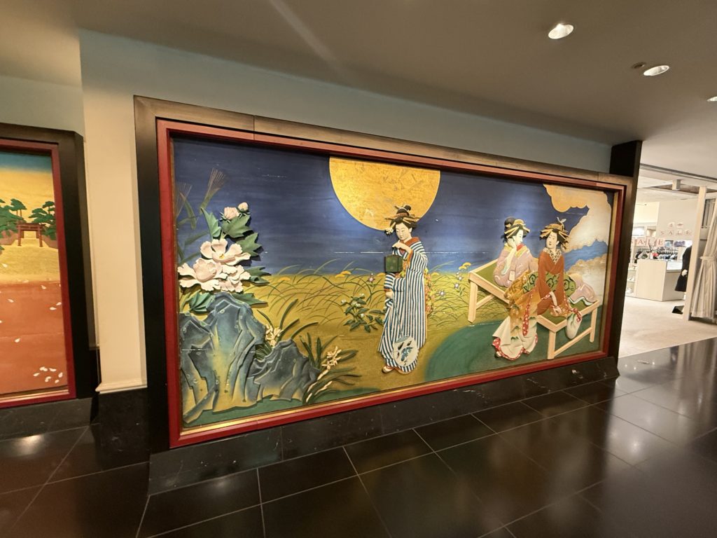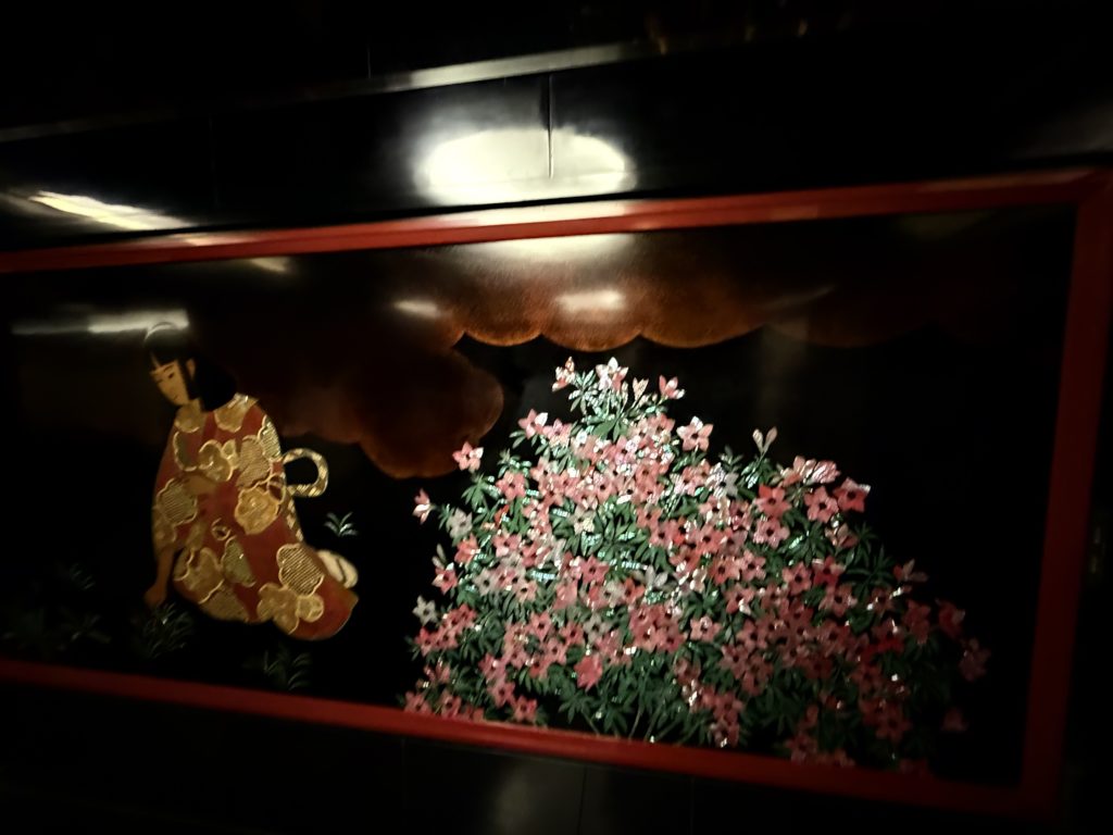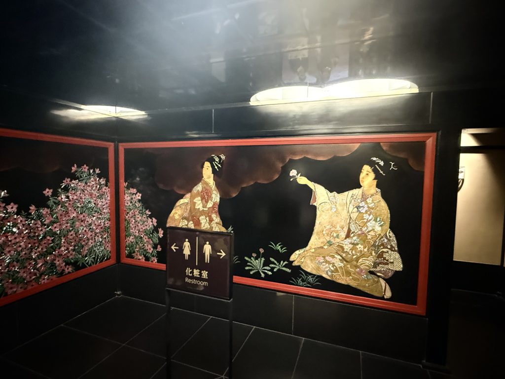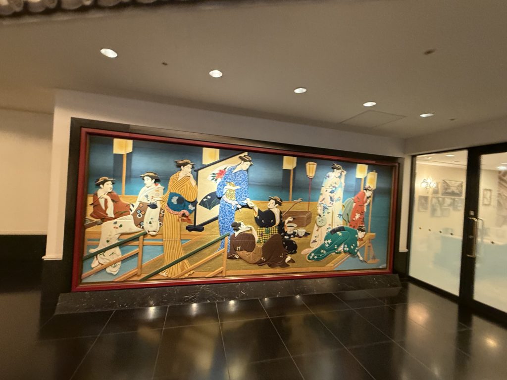 ロビーに入った瞬間、まず目に飛び込んできたのは、至る所に飾られた美しい日本画や美術工芸品です。壁や天井、柱の装飾に至るまで、細部にわたって日本の伝統美が息づいています。まさに、「美術館の中にいる」という感覚です。