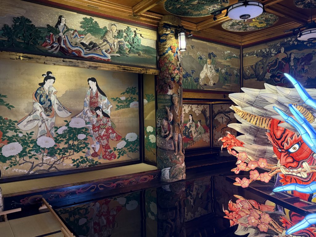 各部屋は、それぞれ異なるテーマを持ち、天井や壁には、その時代を代表する日本画家たちの手によって描かれた豪華な絵画や装飾が施されています。繊細な彫刻、漆塗りの柱、極彩色の天井画…。その美しさには、ただただ圧倒されます。