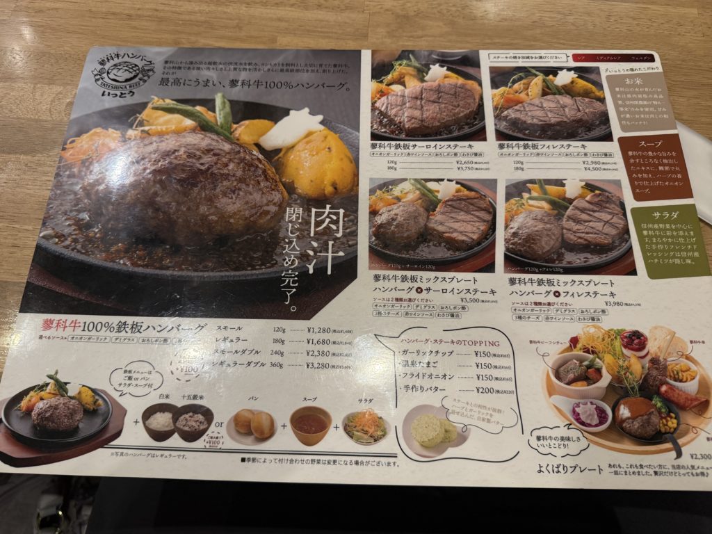 席に着き、メニューを開きます。メインはやはり「蓼科牛100%ハンバーグ」ですが、様々なサイズやセットが用意されています。